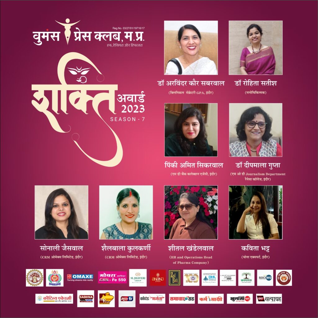 वुमंस प्रेस क्लब मध्य प्रदेश की अध्यक्ष शीतल रॉय और सचिव ऋतु साहू ने बताया कि पिछले 7 सालों से वुमंस प्रेस क्लब मध्य प्रदेश द्वारा अंतर्राष्ट्रीय महिला दिवस के उपलक्ष में नारी शक्ति के सम्मान में शक्ति अवार्ड का आयोजन किया जा रहा है । इस बार इंदौर शहर के हेरिटेज पैलेस गांधी हॉल में सातवां शक्ति अवार्ड समारोह का आयोजन 4 मार्च 2023 शनिवार शाम 6 बजे आयोजित किया गया है ।