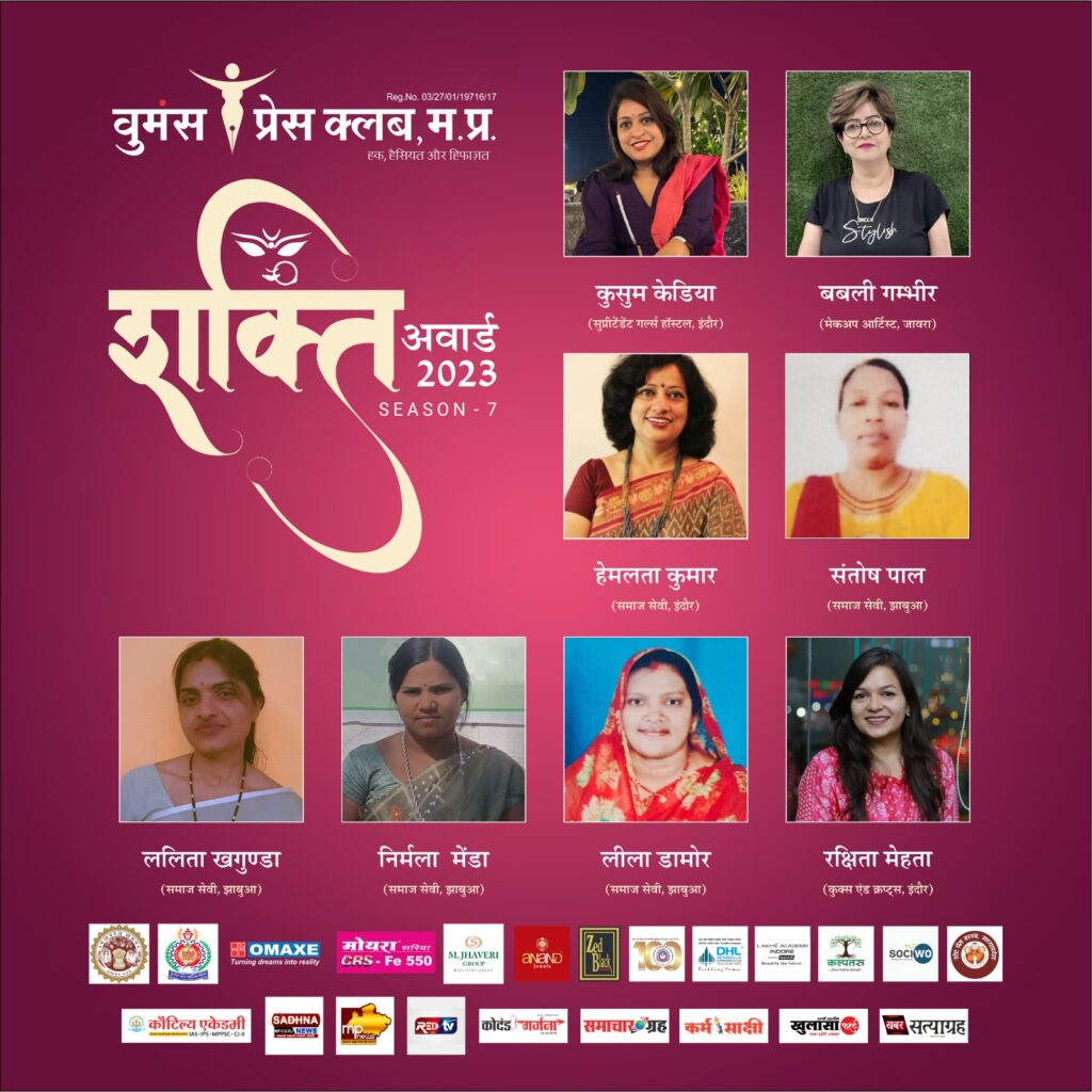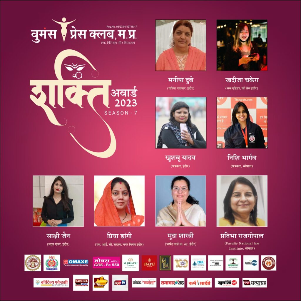 इंदौर। अंतर्राष्ट्रीय महिला दिवस के अवसर पर इस वर्ष भी वुमंस प्रेस क्लब मध्य प्रदेश द्वारा शक्ति अवार्ड समारोह का आयोजन किया जा रहा है। इस मौक़े पर समाज़ में अहम भूमिका निभाने वाली महिला पत्रकारों एवं सामाजिक क्षेत्र में अलग पहचान बनाने वाली अधिकारियों एवं सामाजिक कार्यकर्ताओं को शक्ति अवार्ड सम्मान से नवाजा जाएगा।